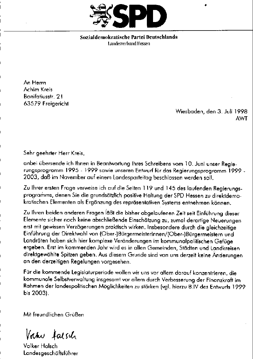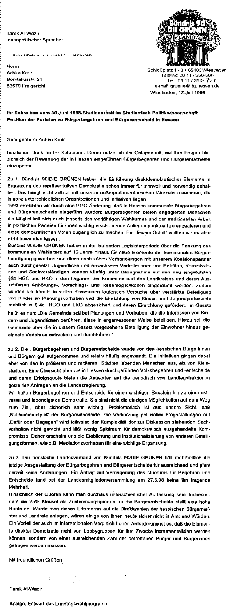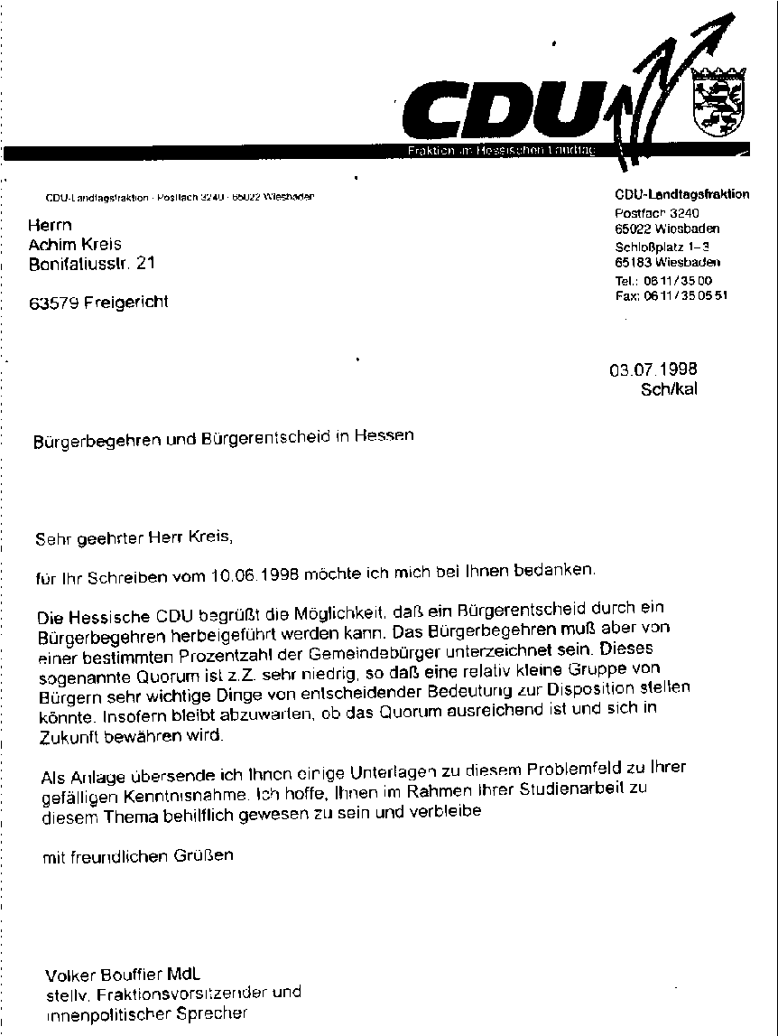 als Student der Politikwissenschaft an der Universität Gießen arbeite ich zur Zeit an einer Studienarbeit zum Thema Bürgerbegehren und Bürgerentscheid in Hessen. Darin soll der Stand der Dinge ebenso wie die Perspektiven dieses Instruments der Bürgerbeteiligung ausgewertet werden. Nach einer Darstellung des geschichtlichen Hintergrundes der Bürgerbeteiligung in der Bundesrepublik und speziell in Hessen, wo 1993 durch den § 8b der Hessischen Gemeindeordnung Bürgerbegehren und Bürgerentscheid neu eingeführt wurden, möchte ich gerne die Positionen der im Landtag vertretenen Parteien darlegen und auswerten. Im Vorfeld der Landtagswahl im Februar 1999 werden auch Sie sicherlich Bilanz ziehen und Ihre Vorstellungen im Wahlprogramm festlegen.